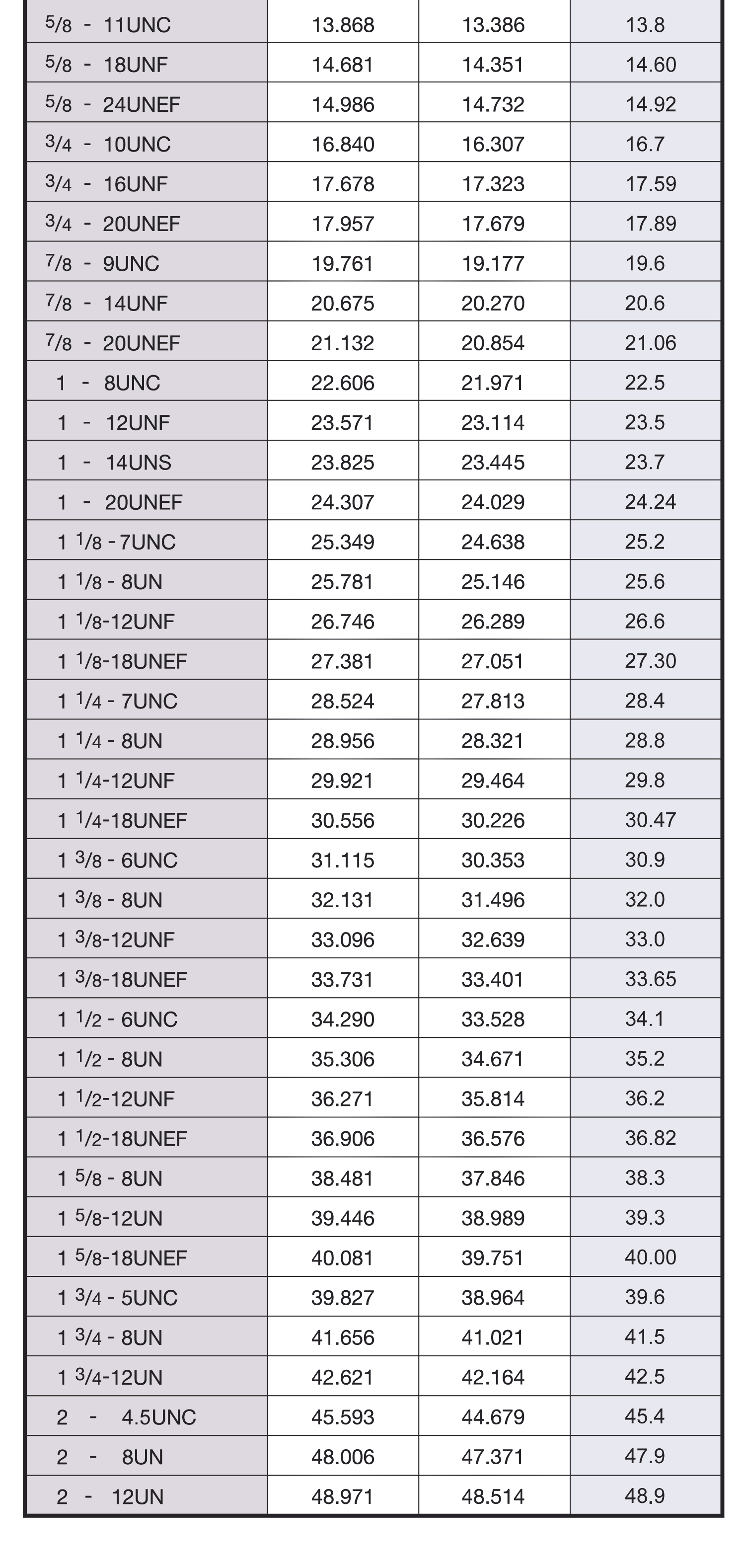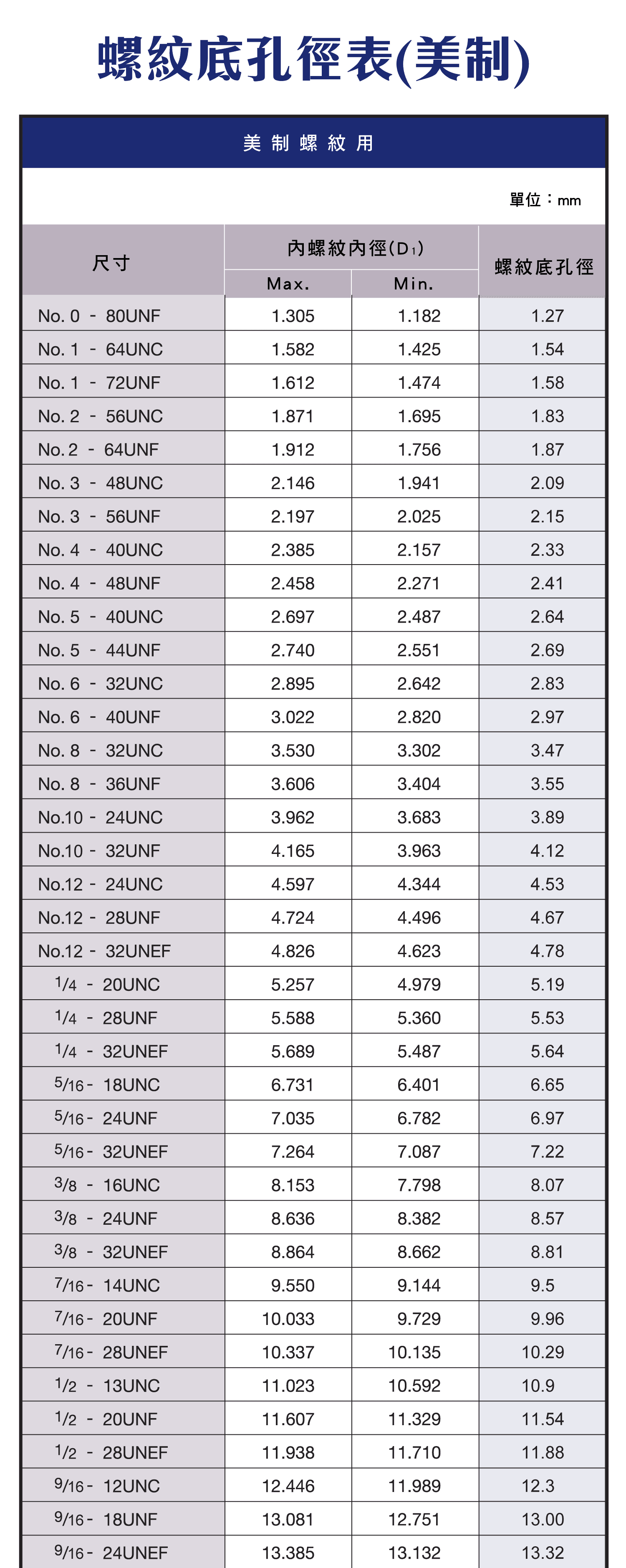 YAMAWA絲攻,螺紋底孔徑表(美制),美制螺紋用