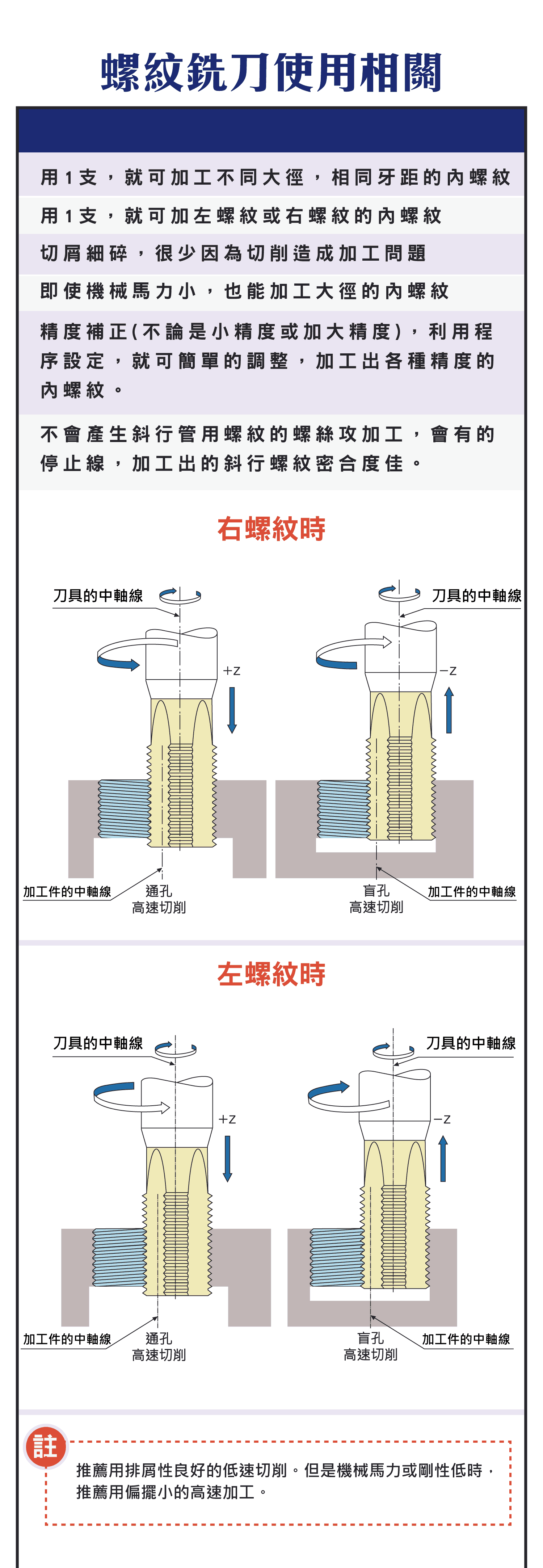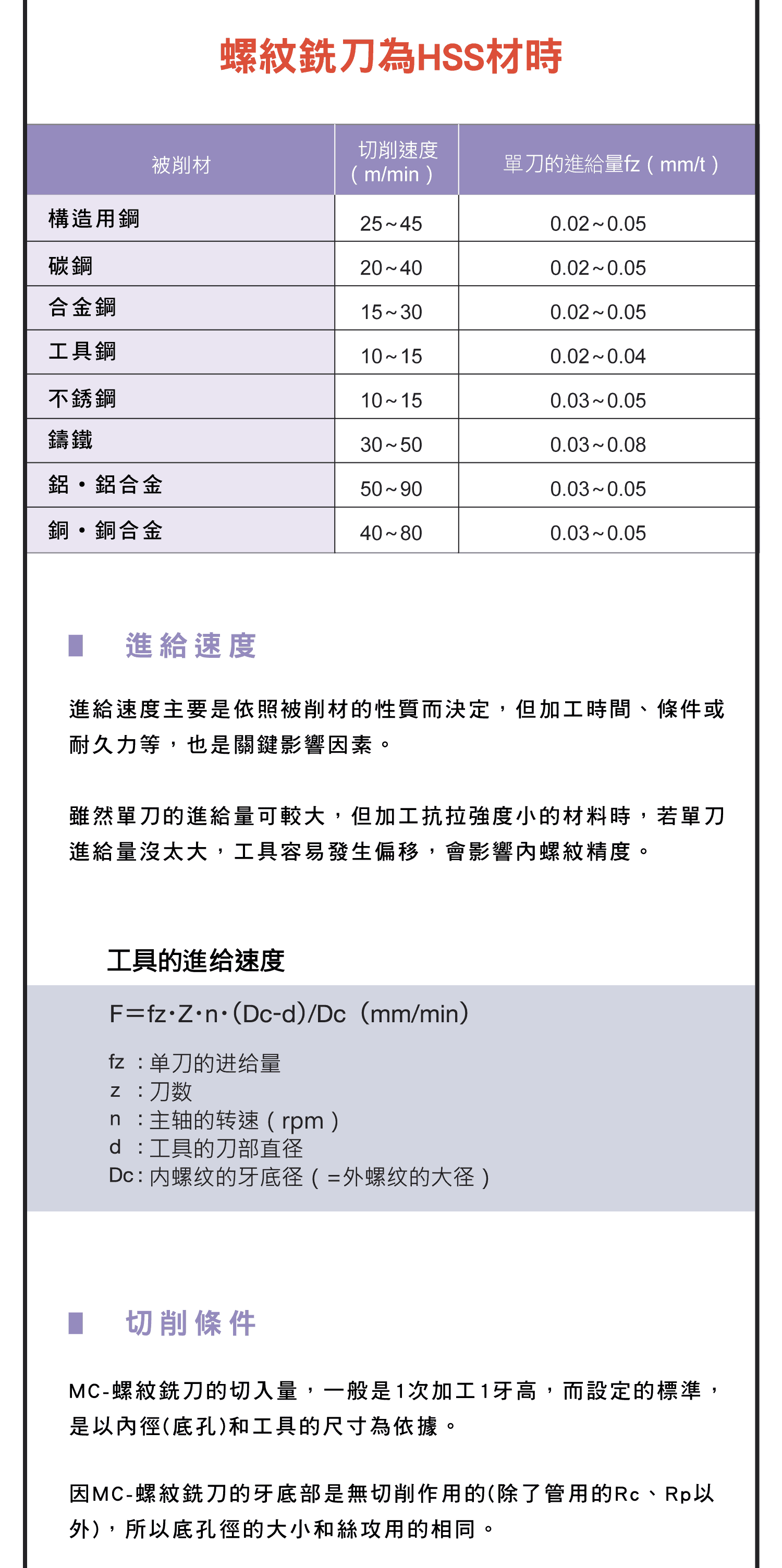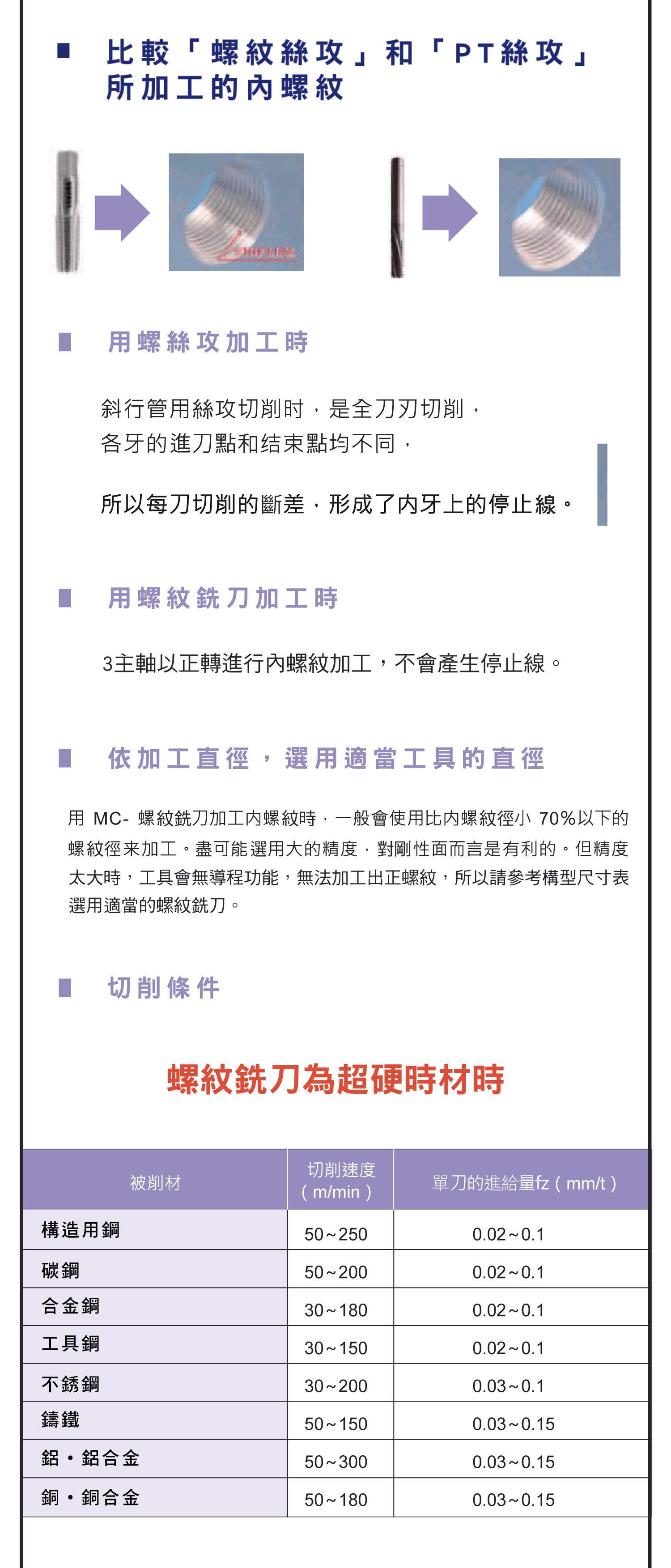 螺紋銑刀的使用說明,比較螺紋絲攻和PT絲攻所加工的內螺紋的示意圖說明,各種螺紋銑刀材切削條件圖表