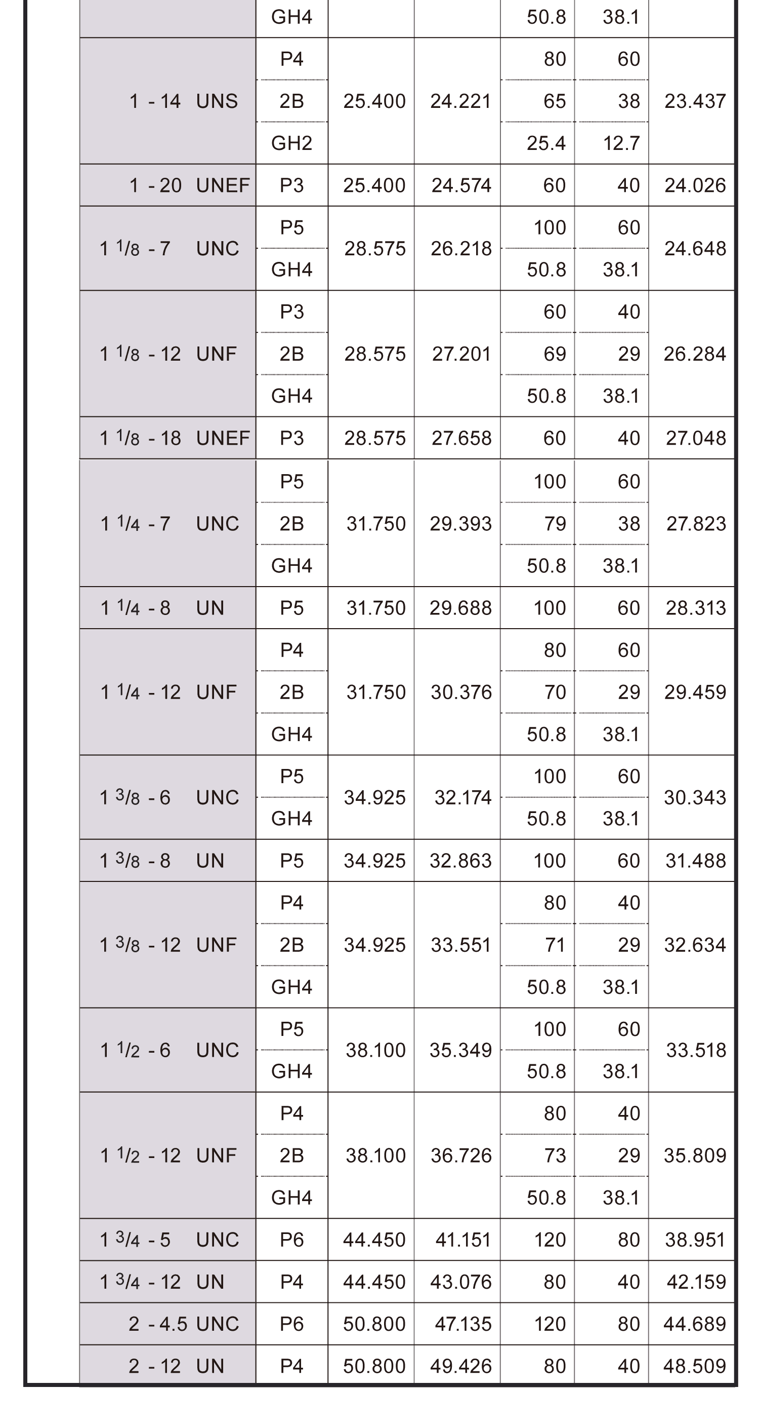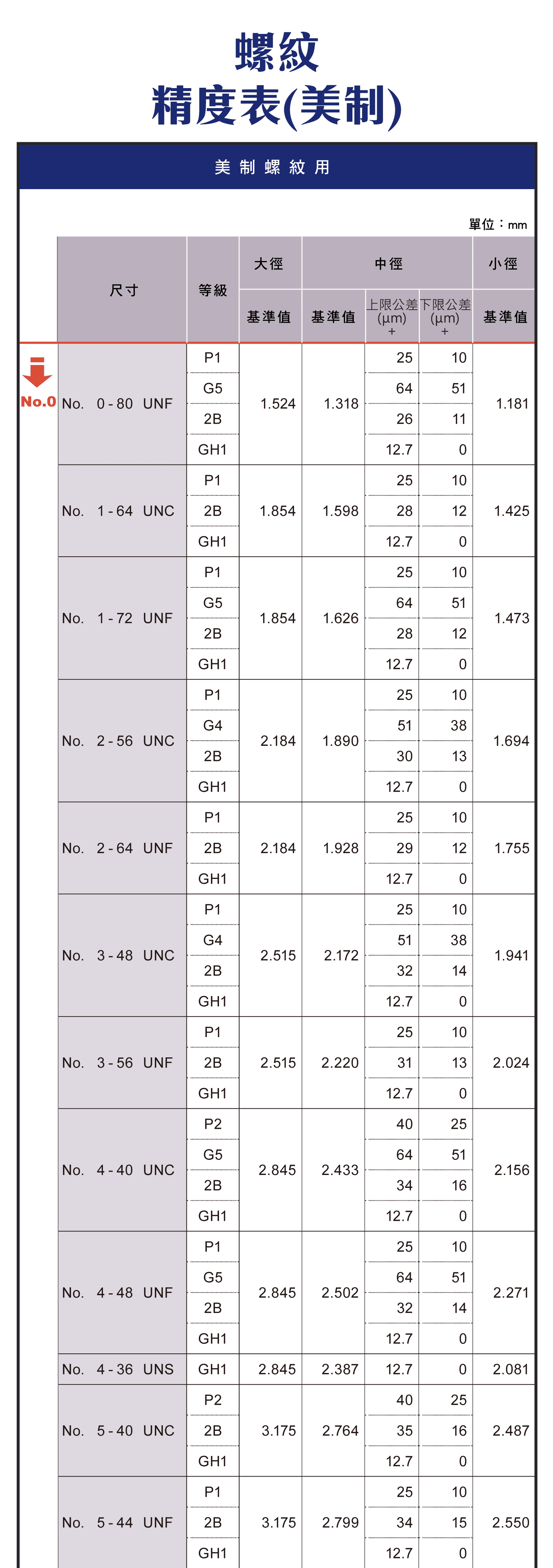 螺紋精度表(美制)各種尺寸圖表,