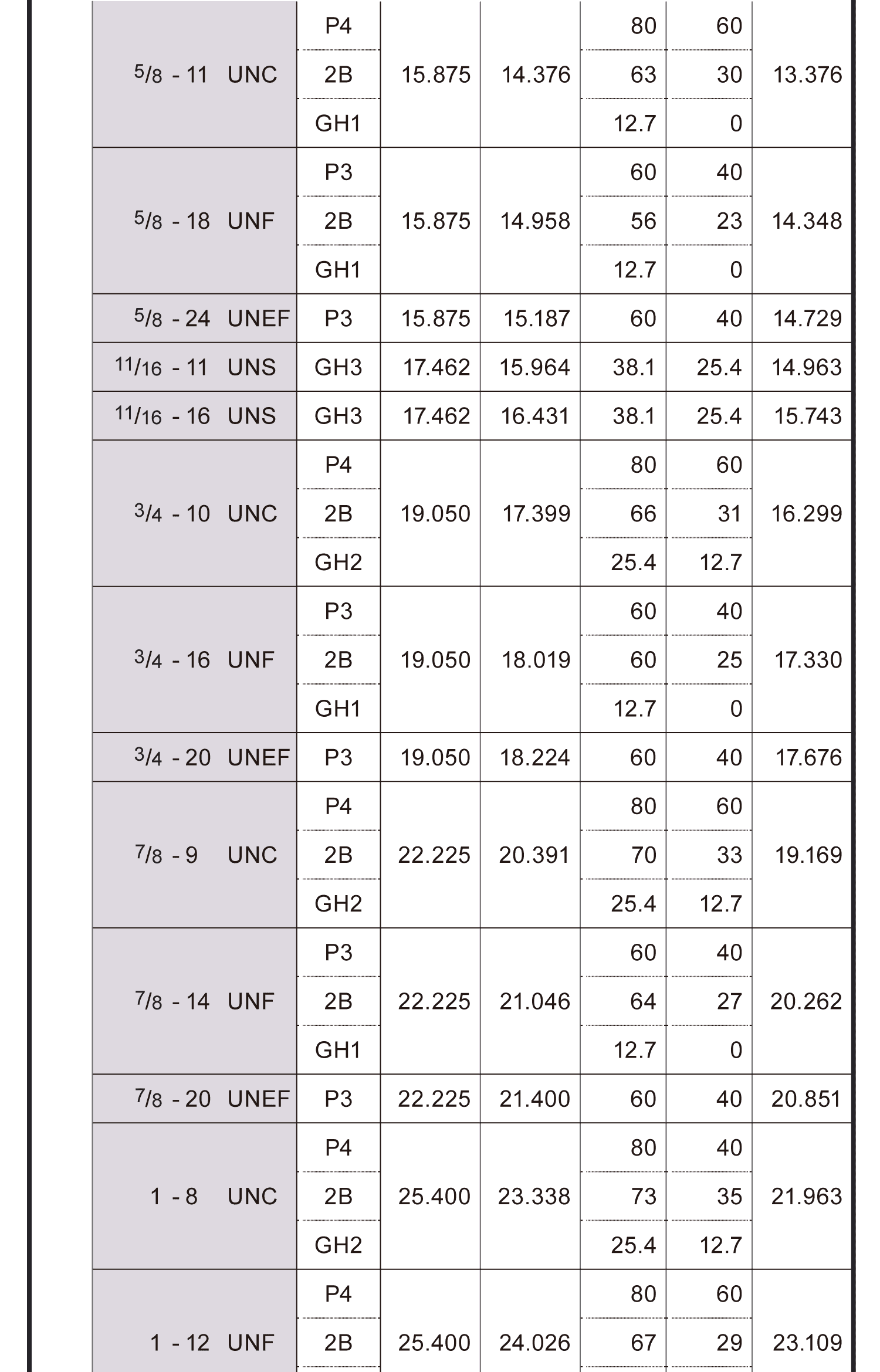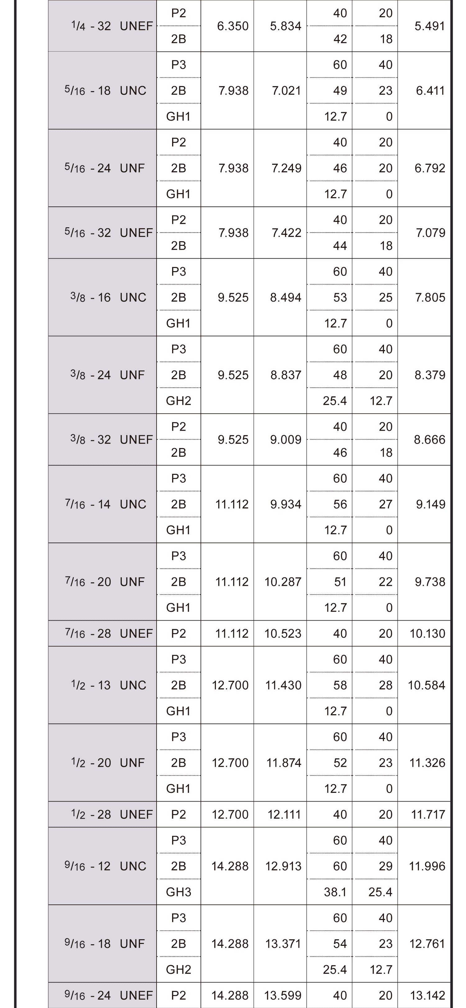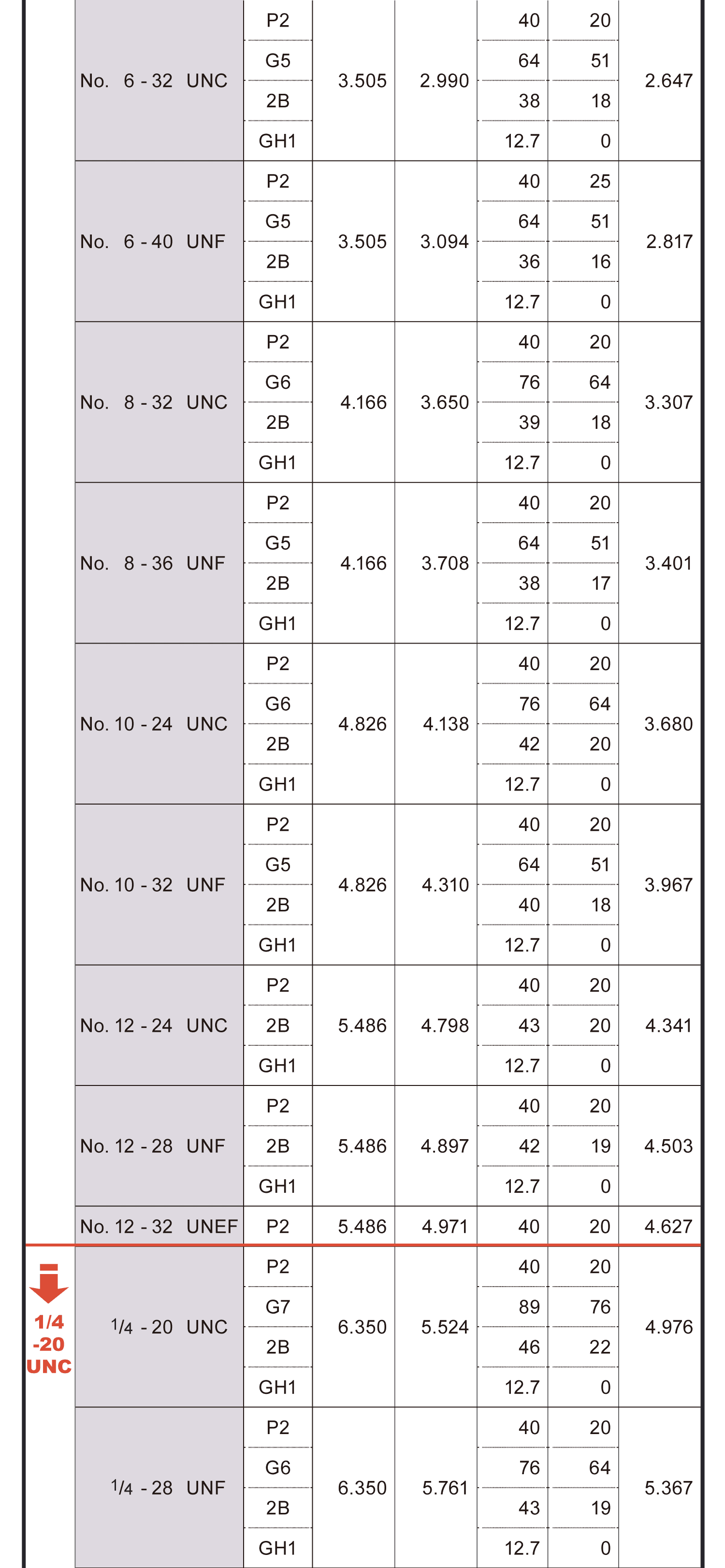 螺絲攻螺紋精度表(美制)