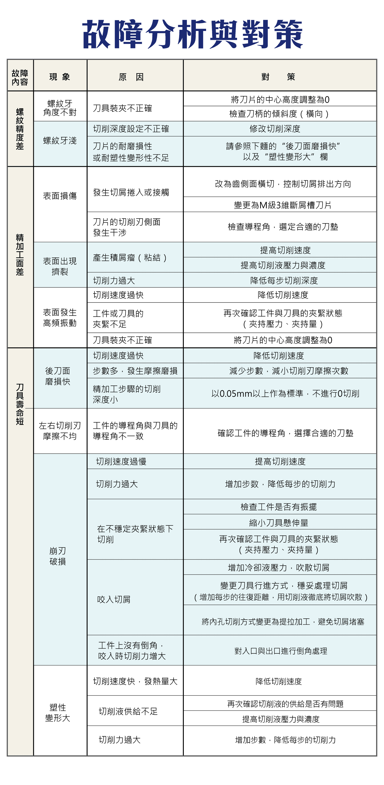 螺紋加工遇到故障的分析和應對辦法,遇到螺紋精度差的原因和解決辦法,遇到精加工面差的原因和解決辦法,遇到刀具壽命短的原因和解決辦法